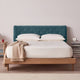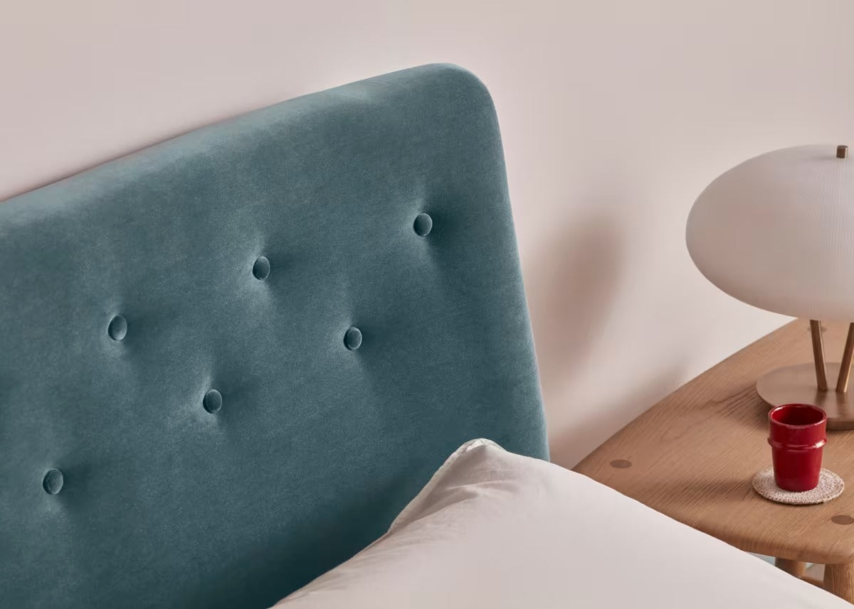 سرير مودرن بتصميم راقٍ يجمع بين قاعدة خشبية طبيعية متينة وظهر مُبطن بلون بترولي جذاب مزود بتفاصيل أزرار أنيقة تضيف لمسة فخامة هادئة، ليمنح غرفة نومك طابعًا عصريًا دافئًا ويوفر لك أقصى درجات الراحة والثبات مع جودة عالية تدوم وأناقة تلفت الأنظار من أول نظرة.
