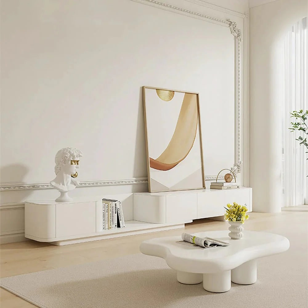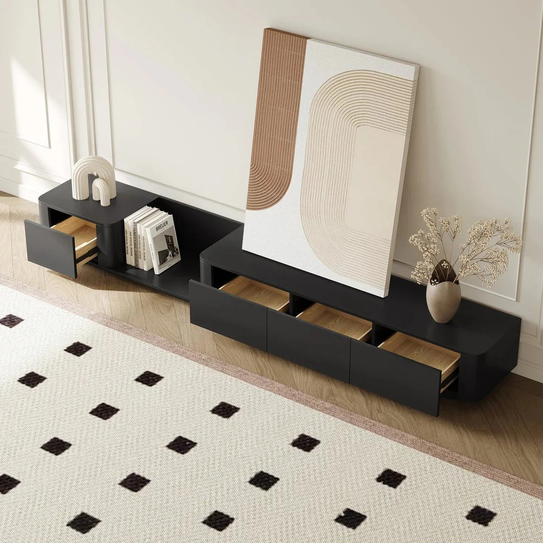 طاولة تلفاز عصرية بتصميم أنيق باللونين الأبيض والأسود، تضيف لمسة مودرن قوية إلى غرفة المعيشة. يأتي السطح باللون الأبيض الهادئ ليمنح إحساسًا بالنقاء والاتساع، بينما يضيف اللون الأسود في الهيكل أو الأدراج لمسة فاخرة وتباينًا جذابًا يلفت الأنظار.