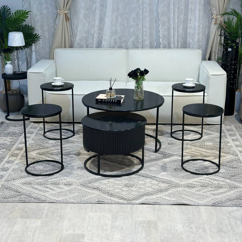 طقم أنيق وعصري يتكوّن من طاولتين متداخلتين وأربع طاولات خدمة جانبية، يوفر حلاً مثاليًا للتنسيق المرن والضيافة اليومية. يجمع بين التصميم الراقي وسهولة الاستخدام ليتناسب مع مختلف المساحات.