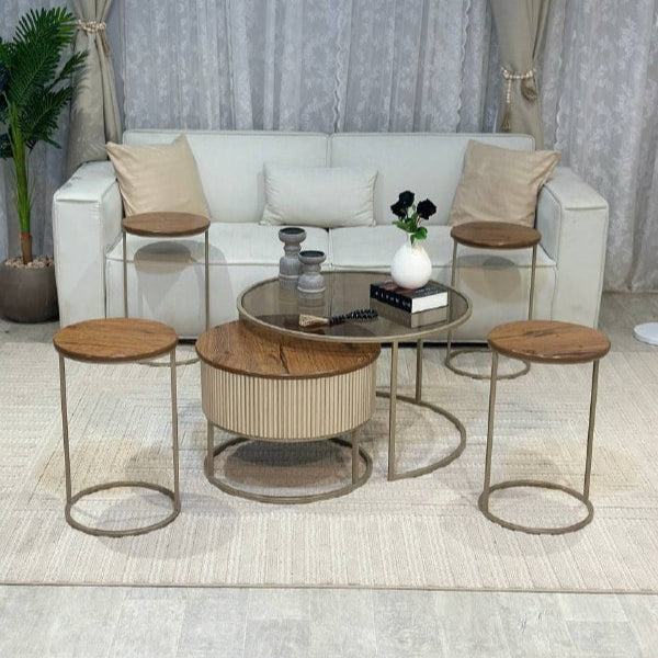 طقم أنيق يجمع بين الخشب الطبيعي والزجاج البني بتصميم عصري عملي. يتكوّن من طاولتين متداخلتين وأربع طاولات خدمة جانبية، مثالي لتجهيز مساحة ضيافة متكاملة تضيف لمسة فاخرة لأي غرفة.
