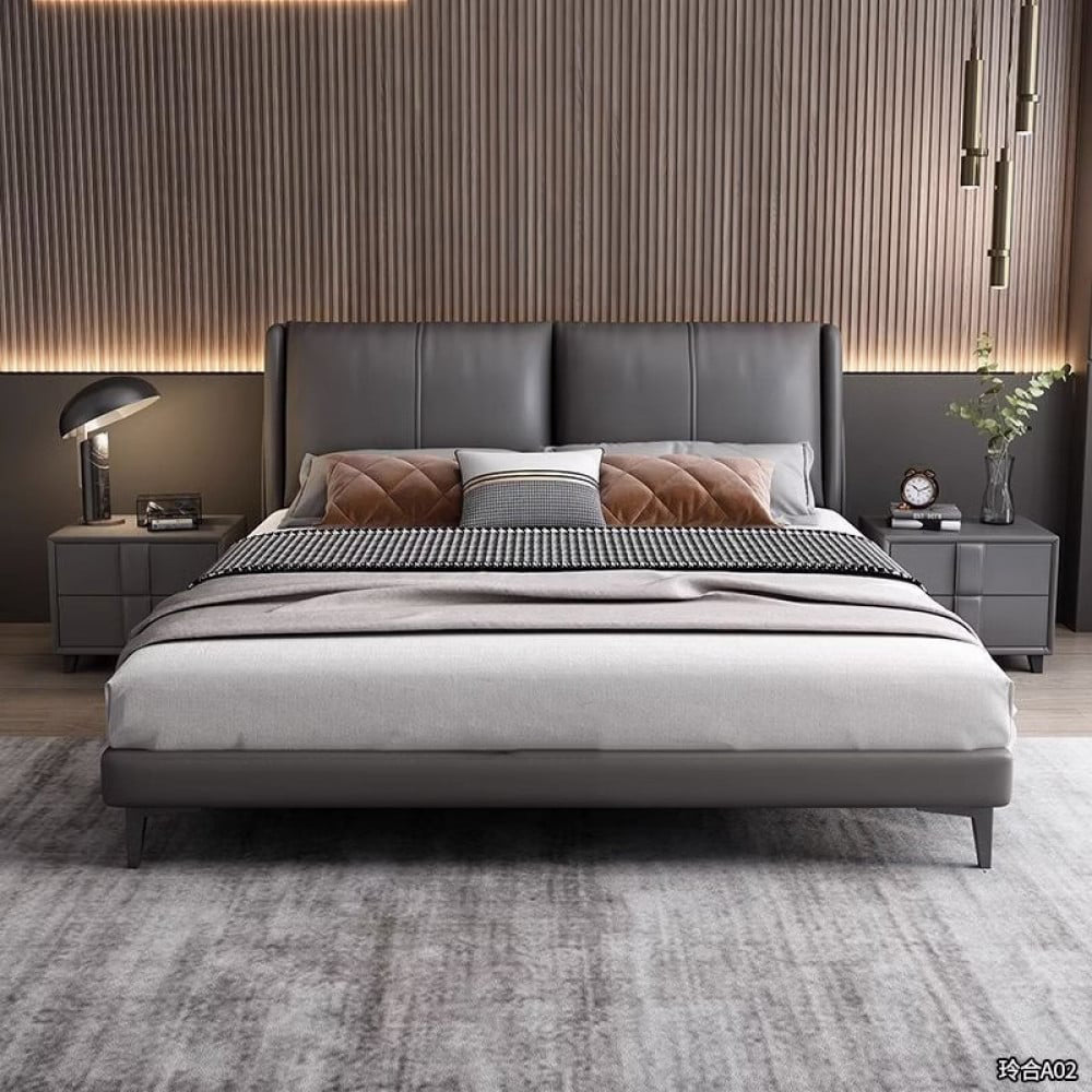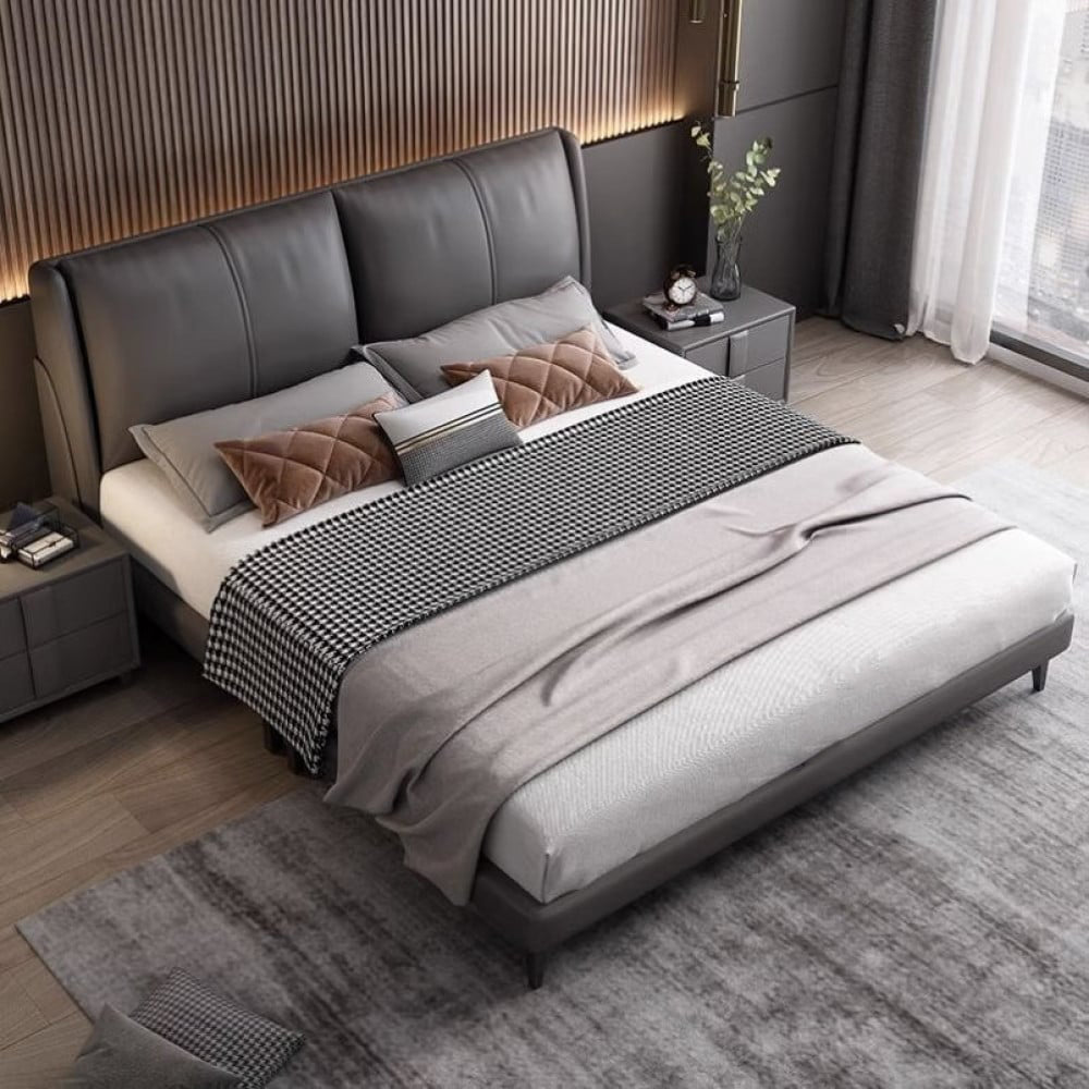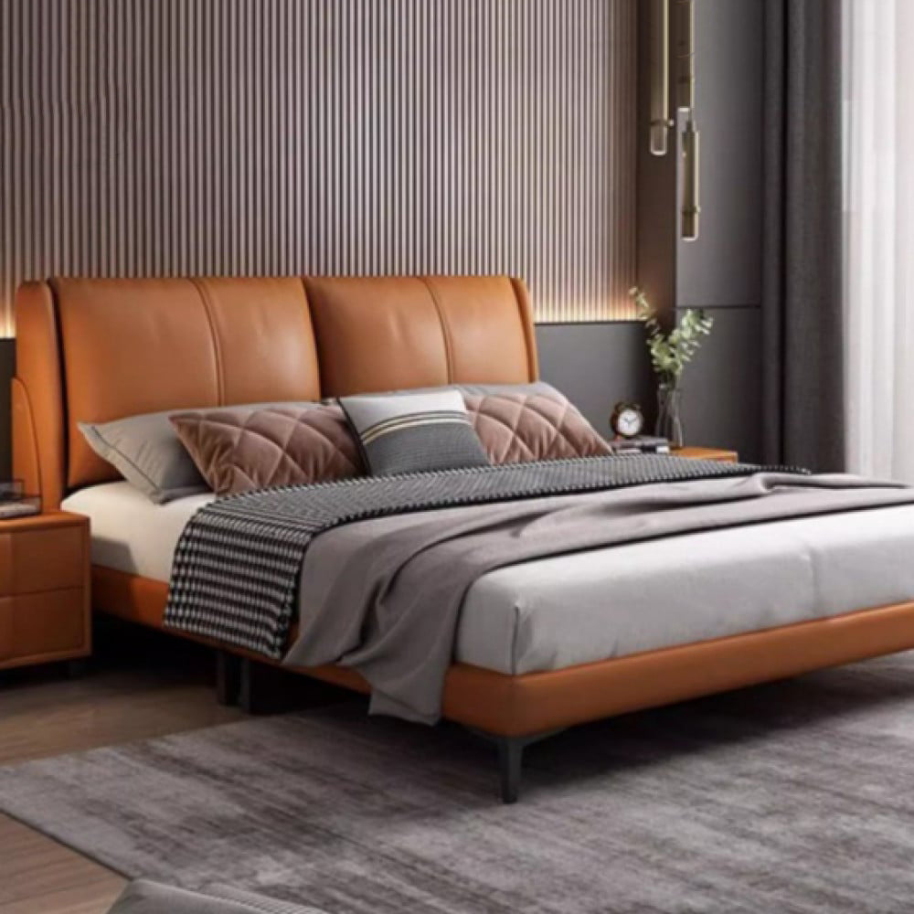 سرير جلد فاخر بتصميم إيطالي، هيكله مصنوع من خشب البلوط المتين وظهره محشو بطبقة إسفنج عالية الكثافة. يتميز بتغطية كاملة بطبقة من الجلد ما يجعله مقاوماً للتمزق ويدوم طويلاً. يحتوي السرير على أرجل مصنوعة من المعدن الصلب يأتي بألوان راقية منها الرمادي و البيج