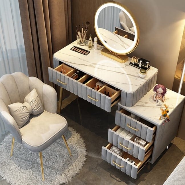 أضيفي لمسة عصرية إلى غرفتك مع تسريحة أنيقة تجمع بين المعدن والخشب بلمسات من القماش المخملي الناعم.
